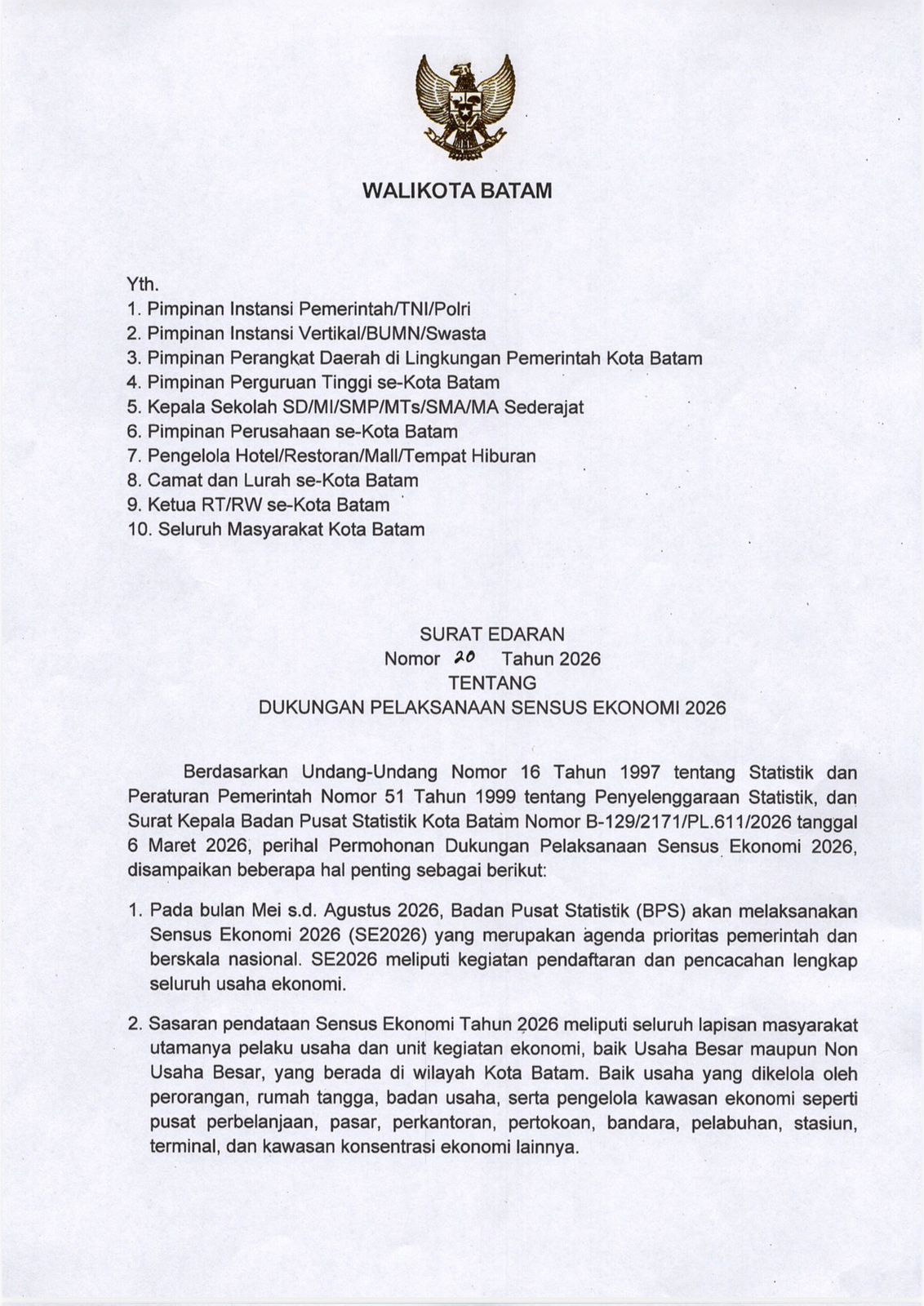 MaklumatKepri.Com. Batam-Pemerintah Kota (Pemko) Batam resmi menerbitkan Surat Edaran Wali Kota Batam (SE) Nomor 20 Tahun 2026 tentang Dukungan Pelaksanaan Sensus Ekonomi 2026 (SE2026). Langkah ini merupakan bentuk komitmen Pemerintah Daerah dalam menyukseskan agenda prioritas nasional yang dilaksanakan oleh Badan Pusat Statistik (BPS).