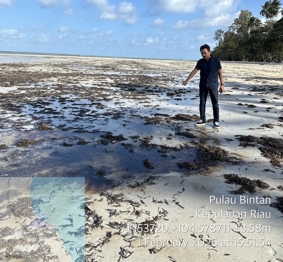 MaklumatKepri.com – Bintan – Pesisir Pantai Trikora kembali tercemar limbah minyak hitam (sludge oil). Tumpahan limbah hidrokarbon pekat ditemukan menghampar di kawasan Mutiara Beach Resort, Jalan Trikora Kilometer 55, Desa Malang Rapat, Kecamatan Gunung Kijang, Kabupaten Bintan, Kepulauan Riau, Minggu (1/2/2026). Kejadian ini menambah panjang catatan pencemaran berulang di perairan Bintan yang hingga kini belum pernah dituntaskan secara hukum.